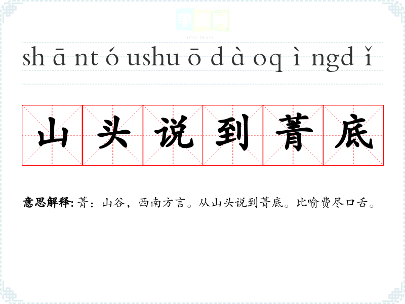 | 山头说到菁底 | 菁:山谷,西南方言。从山头说到菁底。比喻费尽口舌。 |