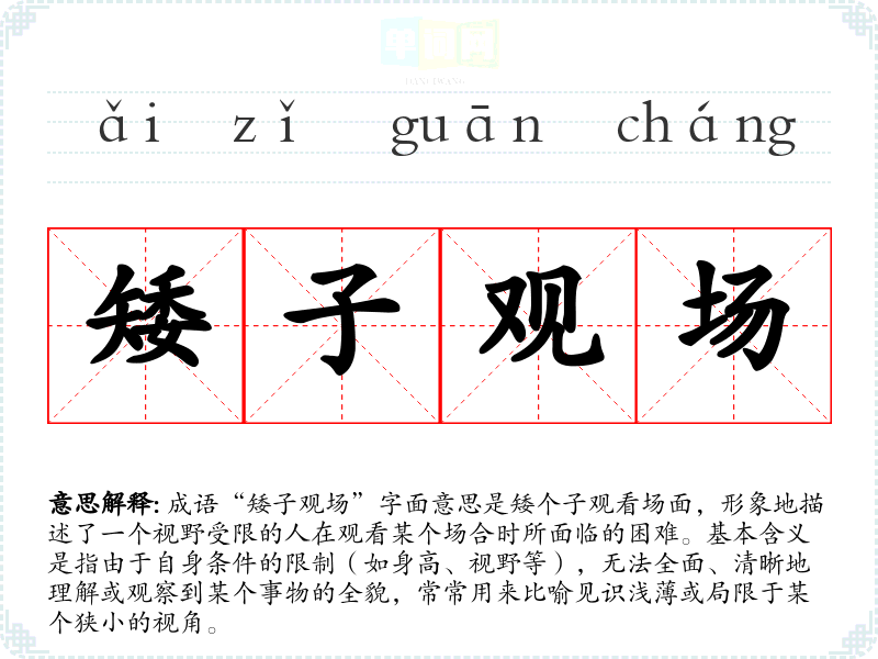 成语“矮子观场”字面意思是矮个子观看场面,形象地描述了一个视野受限的人在观看某个场合时所面临的困难。基本含义是指由于自身条件的限制(如身高、视野等),无法全面、清晰地理解或观察到某个事物的全貌,常常用来比喻见识浅*或局限于某个狭小的视角。