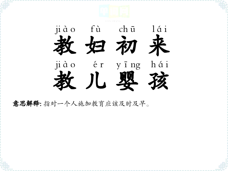 | 教妇初来,教儿婴孩 | 指对一个人施加教育应该及时及早。 |