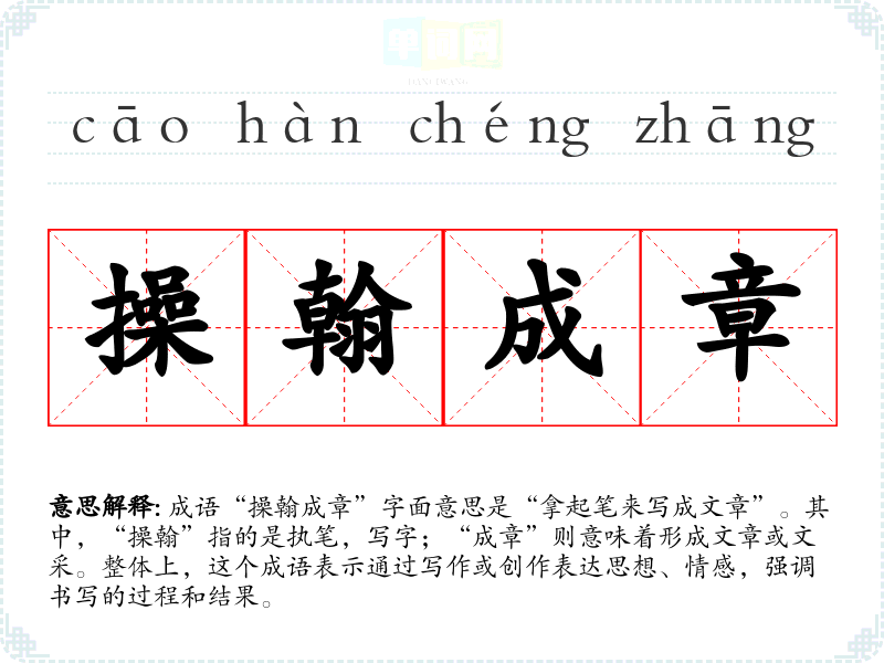 成语“操翰成章”字面意思是“拿起笔来写成文章”。其中,“操翰”指的是执笔,写字;“成章”则意味着形成文章或文采。整体上,这个成语表示通过写作或创作表达思想、情感,强调书写的过程和结果。