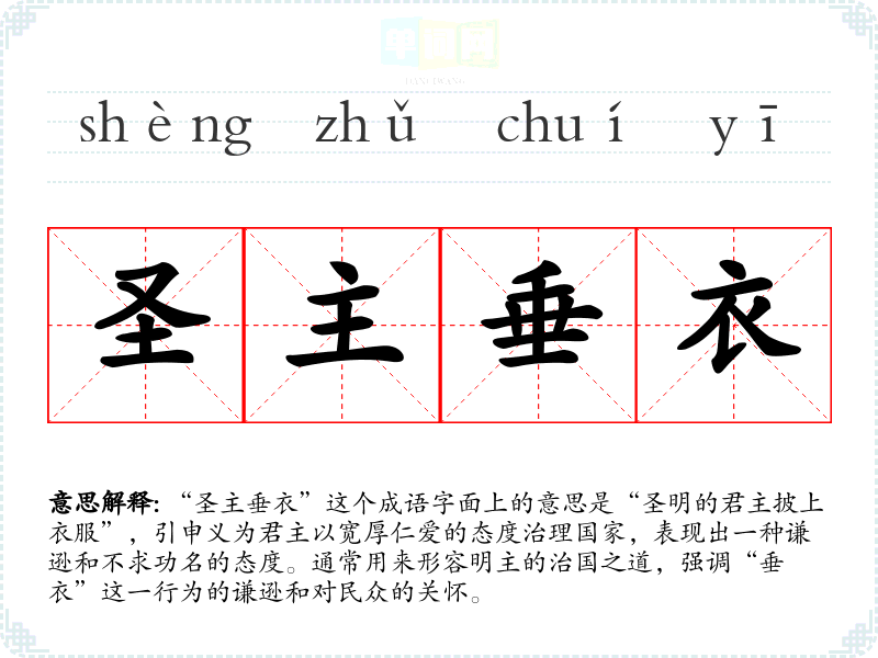 “圣主垂衣”这个成语字面上的意思是“圣明的君主披上衣服”,引申义为君主以宽厚仁爱的态度治理国家,表现出一种谦逊和不求功名的态度。通常用来形容明主的治国之道,强调“垂衣”这一行为的谦逊和对民众的关怀。