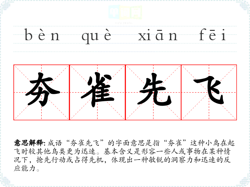 成语“夯雀先飞”的字面意思是指“夯雀”这种**在起飞时较其他鸟类更为迅速。基本含义是形容一些人或事物在某种情况下,抢先行动或占得先机,体现出一种敏锐的洞察力和迅速的反应能力。