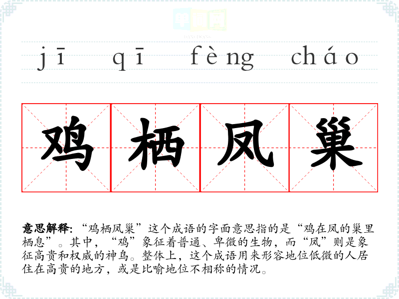 “鸡栖凤巢”这个成语的字面意思指的是“鸡在凤的巢里栖息”。其中,“鸡”象征着普通、卑微的生物,而“凤”则是象征高贵和权威的神鸟。整体上,这个成语用来形容地位低微的人居住在高贵的地方,或是比喻地位不相称的情况。