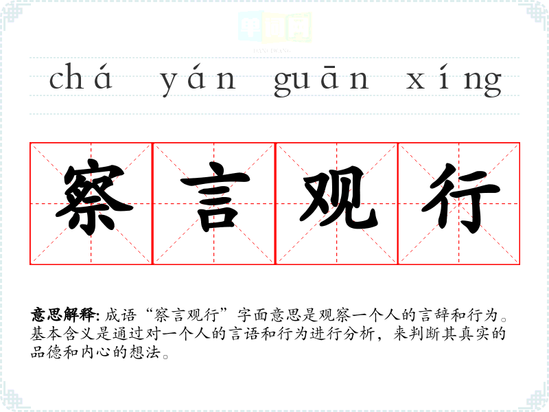 成语“察言观行”字面意思是观察一个人的言辞和行为。基本含义是通过对一个人的言语和行为进行分析,来判断其真实的品德和内心的想法。