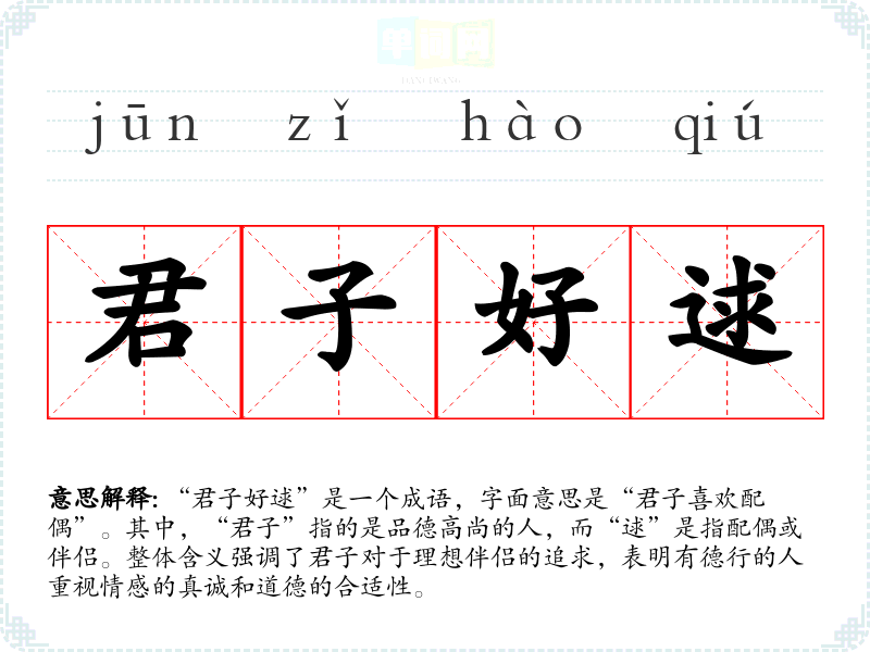 “君子好逑”是一个成语,字面意思是“君子喜欢配偶”。其中,“君子”指的是品德高尚的人,而“逑”是指配偶或伴侣。整体含义强调了君子对于理想伴侣的追求,表明有德行的人重视情感的真诚和道德的合适性。