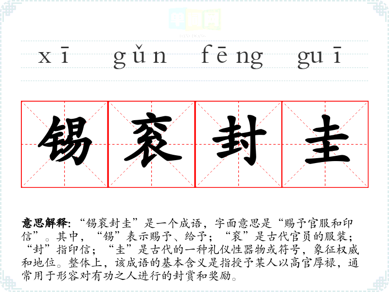 “锡衮封圭”是一个成语,字面意思是“赐予官服和印信”。其中,“锡”表示赐予、给予;“衮”是古代官员的服装;“封”指印信;“圭”是古代的一种礼仪性器物或符号,象征权威和地位。整体上,该成语的基本含义是指授予某人以高官厚禄,通常用于形容对有功之人进行的封赏和奖励。