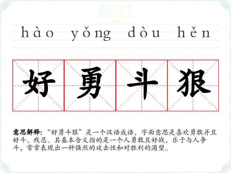 | 好勇斗狠 | 狠:暴戾,凶恶,残忍。爱逞威风,喜欢斗欧。形容人凶强好斗。 |