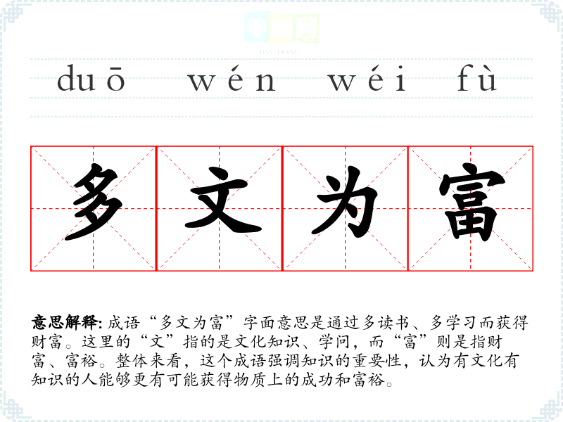成语“多文为富”字面意思是通过多读书、多学*而获得财富。这里的“文”指的是文化知识、学问,而“富”则是指财富、富裕。整体来看,这个成语强调知识的重要性,认为有文化有知识的人能够更有可能获得物质上的成功和富裕。