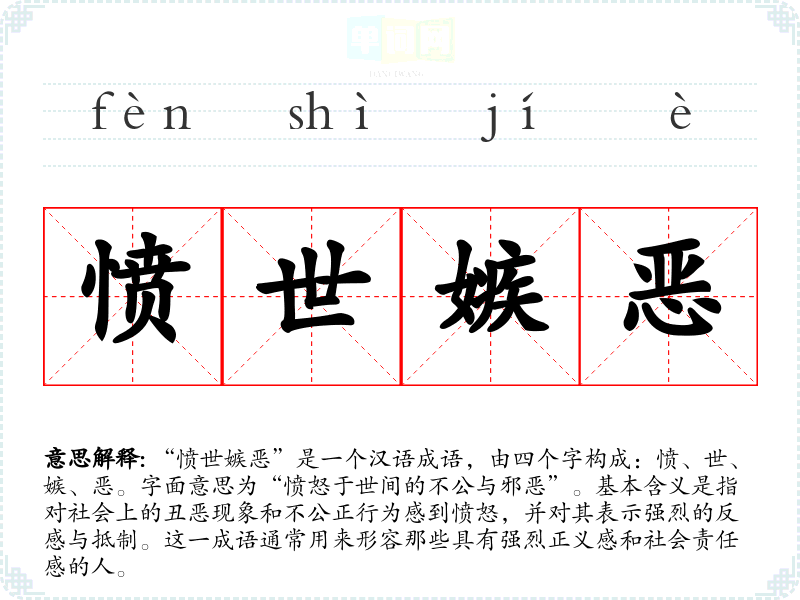 “愤世嫉恶”是一个汉语成语,由四个字构成:愤、世、嫉、恶。字面意思为“愤怒于世间的不公与邪恶”。基本含义是指对社会上的丑恶现象和不公正行为感到愤怒,并对其表示强烈的反感与抵制。这一成语通常用来形容那些具有强烈正义感和社会责任感的人。