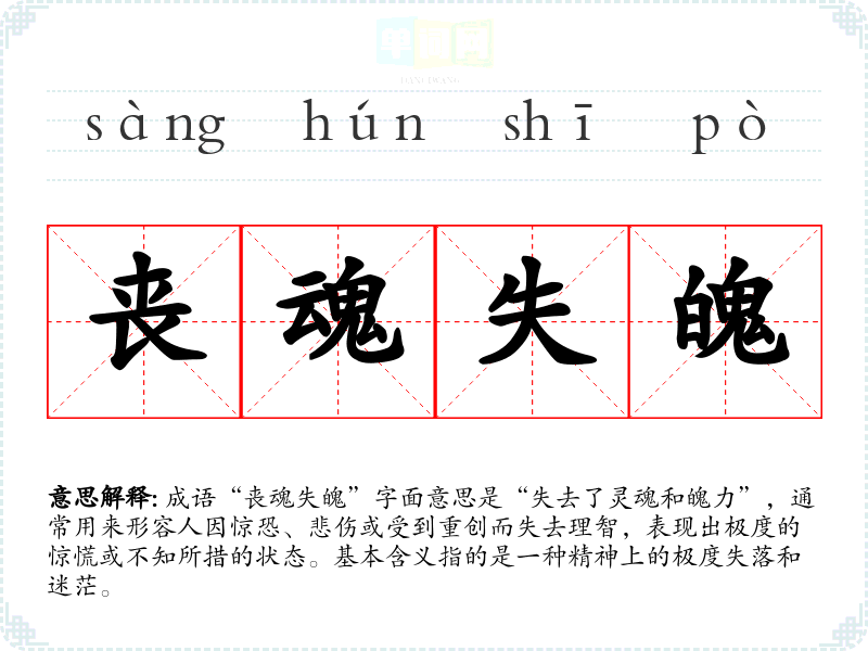 成语“丧魂失魄”字面意思是“失去了灵魂和魄力”,通常用来形容人因惊恐、悲伤或受到重创而失去理智,表现出极度的惊慌或不知所措的状态。基本含义指的是一种精神上的极度失落和迷茫。