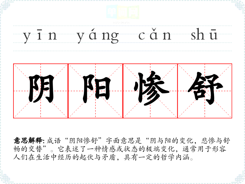 成语“阴阳惨舒”字面意思是“阴与阳的变化,悲惨与舒畅的交替”。它表述了一种情感或状态的极端变化,通常用于形容人们在生活中经历的起伏与矛盾,具有一定的哲学内涵。