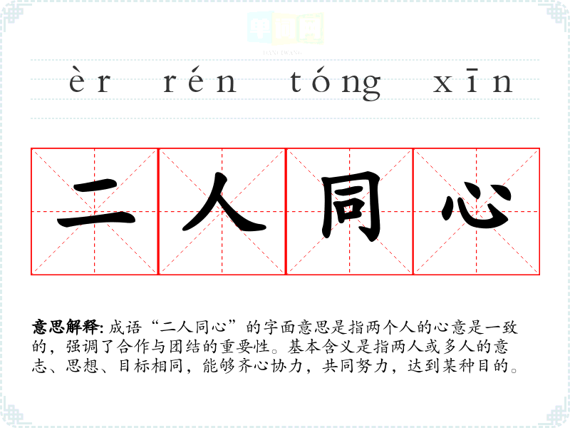 “二人同心”并没有特定的历史典故或文学出处,它的构成是由“二人”和“同心”两个部分组成。“同心”在古代文献中常常用来形容志同道合的人,强调合作与团结的精神。其意义在于强调团队合作的重要性,表达了相互信任和支持的价值观。