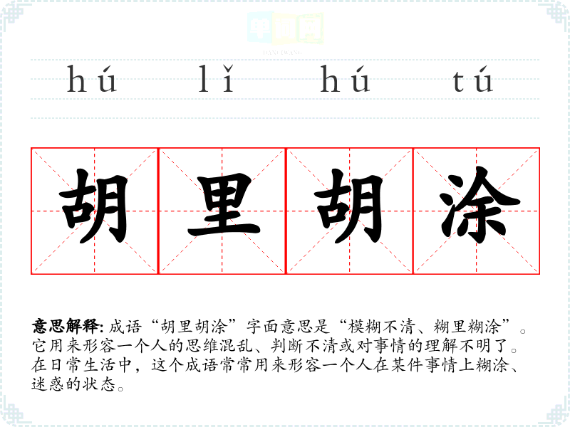 成语“胡里胡涂”字面意思是“模糊不清、糊里糊涂”。它用来形容一个人的思维混乱、判断不清或对事情的理解不明了。在日常生活中,这个成语常常用来形容一个人在某件事情上糊涂、迷惑的状态。