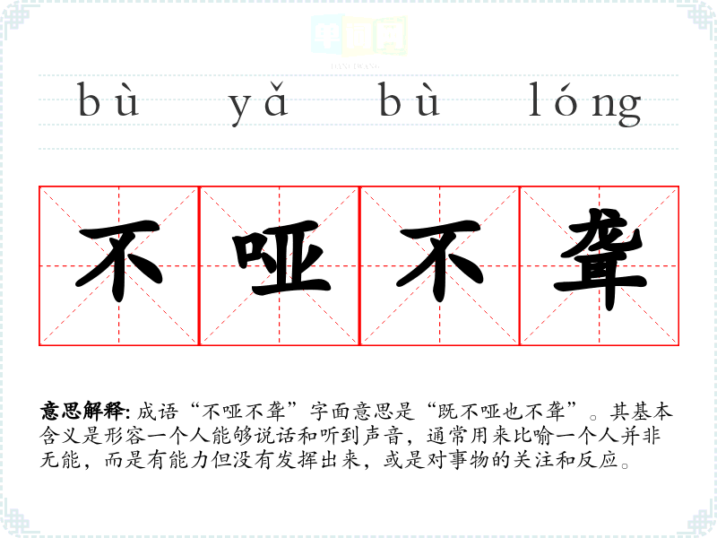 成语“不哑不聋”字面意思是“既不哑也不聋”。其基本含义是形容一个人能够说话和听到声音,通常用来比喻一个人并非无能,而是有能力但没有发挥出来,或是对事物的关注和反应。