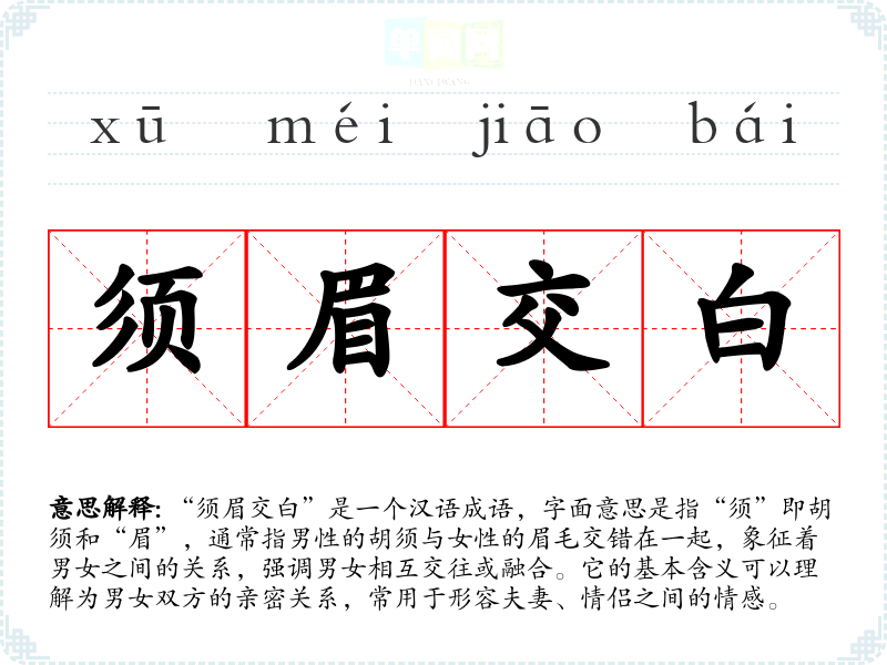 “须眉交白”是一个汉语成语,字面意思是指“须”即胡须和“眉”,通常指男性的胡须与女性的眉毛交错在一起,象征着男女之间的关系,强调男女相互交往或融合。它的基本含义可以理解为男女双方的亲密关系,常用于形容夫妻、情侣之间的情感。