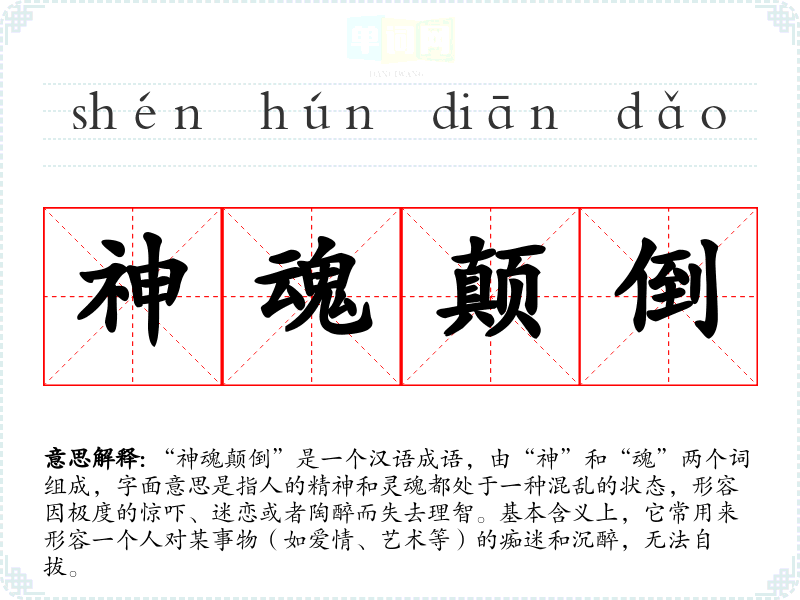 “神魂颠倒”最早见于《红楼梦》中,书中描绘了人物因爱情而神魂颠倒的情景。这一成语的形成与古代哲学思想有关,古人认为“神”和“魂”是人类情感和精神活动的重要组成部分,二者的失衡会导致个体的精神状态失常。