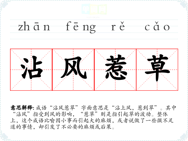成语“沾风惹草”字面意思是“沾上风,惹到草”。其中“沾风”指受到风的影响,“惹草”则是指引起草的波动。整体上,这个成语比喻因小事而引起大的麻烦,或者说做了一些微不足道的事情,却引发了不必要的麻烦或后果。