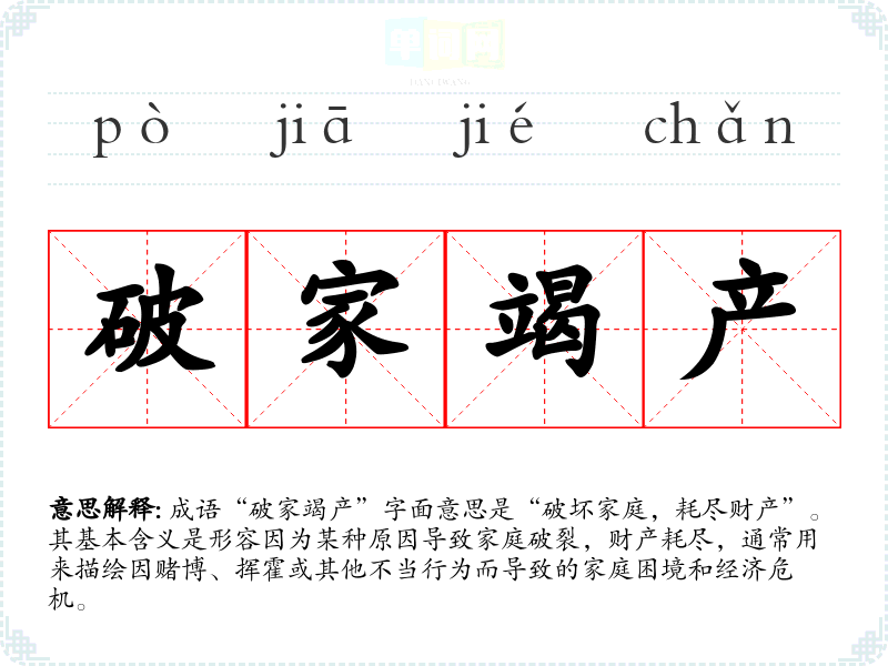 成语“破家竭产”字面意思是“破坏家庭,耗尽财产”。其基本含义是形容因为某种原因导致家庭破裂,财产耗尽,通常用来描绘因赌博、挥霍或其他不当行为而导致的家庭困境和经济危机。