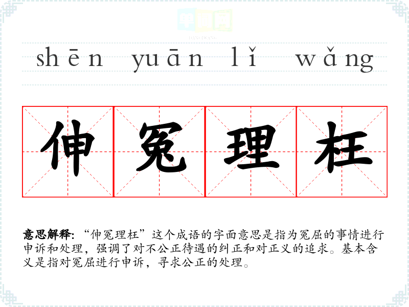 “伸冤理枉”这个成语的字面意思是指为冤屈的事情进行申诉和处理,强调了对不公正待遇的纠正和对正义的追求。基本含义是指对冤屈进行申诉,寻求公正的处理。