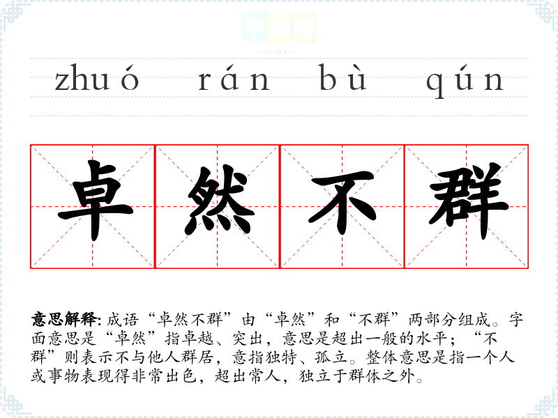 成语“卓然不群”由“卓然”和“不群”两部分组成。字面意思是“卓然”指卓越、突出,意思是超出一般的水平;“不群”则表示不与他人群居,意指独特、孤立。整体意思是指一个人或事物表现得非常出色,超出常人,独立于群体之外。
