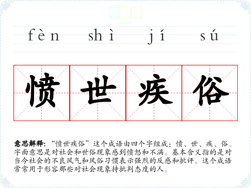 | 愤世嫉俗 | 愤:憎恶,痛恨;嫉:仇恨,痛恨;世、俗:当时的社会状况。有正义感的人对黑暗的现实社会和不合理的习俗表示愤恨、憎恶。 |