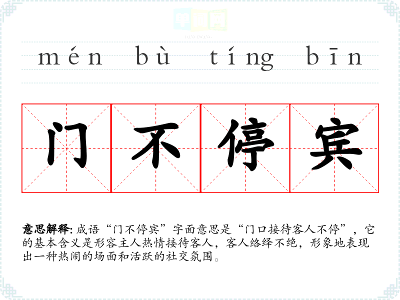 成语“门不停宾”字面意思是“门口接待客人不停”,它的基本含义是形容主人热情接待客人,客人络绎不绝,形象地表现出一种热闹的场面和活跃的社交氛围。