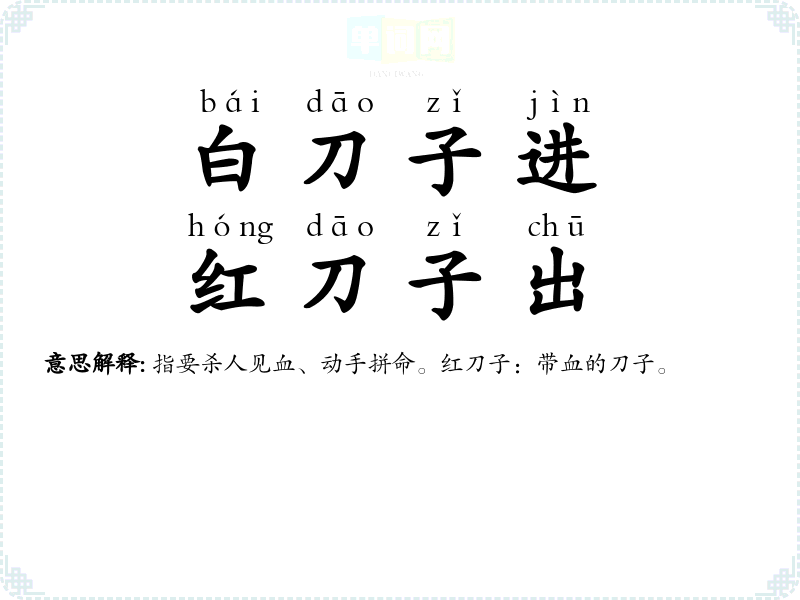 | 白刀子进,红刀子出 | 指要杀人见血、动手拼命。红刀子:带血的刀子。 |