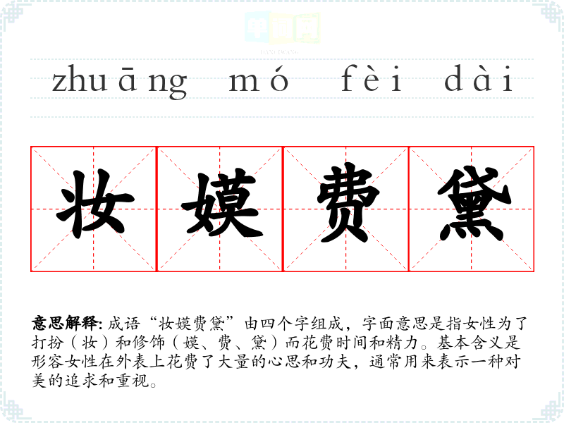 成语“妆嫫费黛”由四个字组成,字面意思是指女性为了打扮(妆)和修饰(嫫、费、黛)而花费时间和精力。基本含义是形容女性在外表上花费了大量的心思和功夫,通常用来表示一种对美的追求和重视。