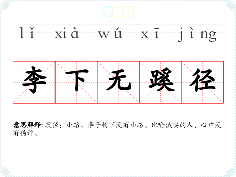 | 李下无蹊径 | 蹊径:小路。李子树下没有小路。比喻诚实的人,心中没有伪诈。 |