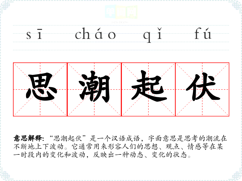 “思潮起伏”是一个汉语成语,字面意思是思考的潮流在不断地上下波动。它通常用来形容人们的思想、观点、情感等在某一时段内的变化和波动,反映出一种动态、变化的状态。
