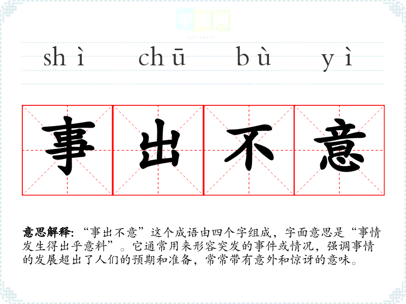 “事出不意”这个成语由四个字组成,字面意思是“事情发生得出乎意料”。它通常用来形容突发的**或情况,强调事情的发展超出了人们的预期和准备,常常带有意外和惊讶的意味。
