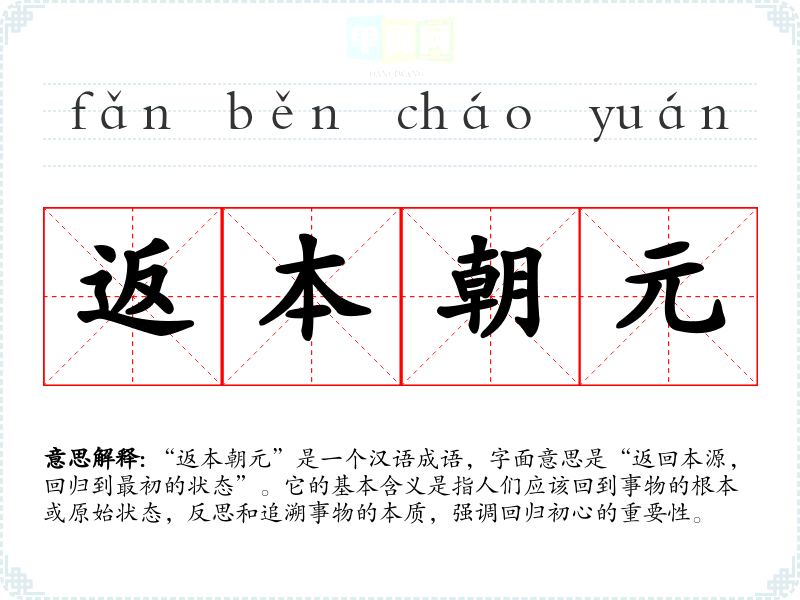 “返本朝元”是一个汉语成语,字面意思是“返回本源,回归到最初的状态”。它的基本含义是指人们应该回到事物的根本或原始状态,反思和追溯事物的本质,强调回归初心的重要性。