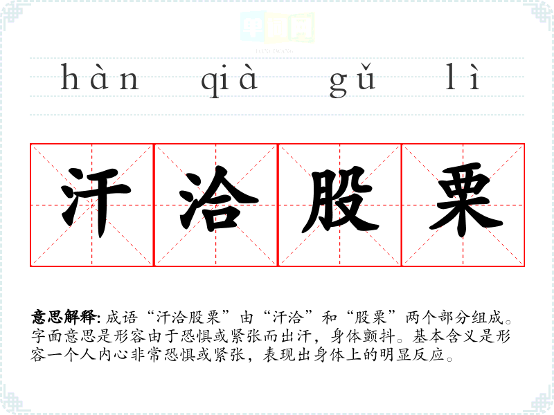 成语“汗洽股栗”由“汗洽”和“股栗”两个部分组成。字面意思是形容由于恐惧或紧张而出汗,身体颤抖。基本含义是形容一个人内心非常恐惧或紧张,表现出身体上的明显反应。