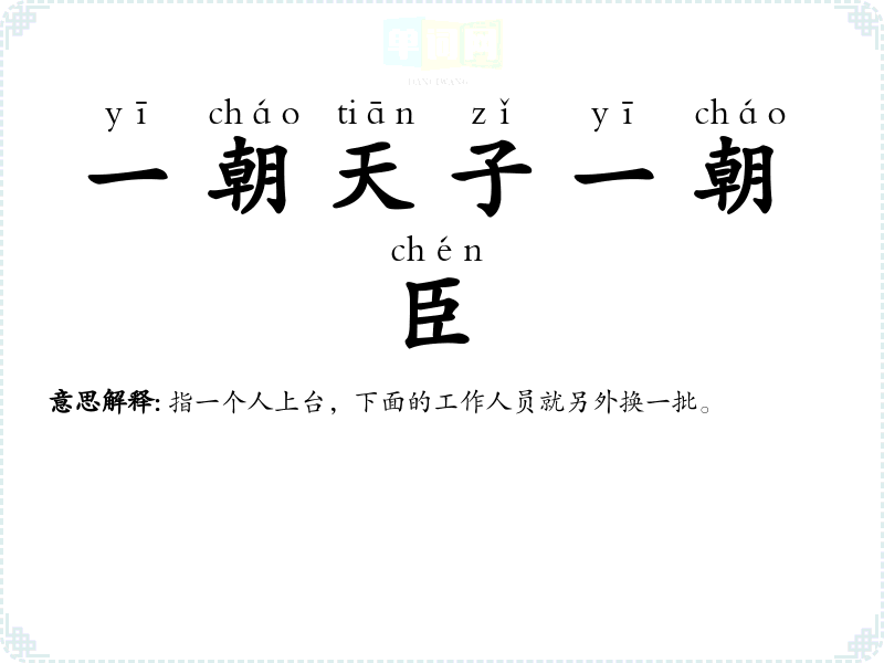 | 一朝天子一朝臣 | 指一个人上台,下面的工作人员就另外换一批。 |