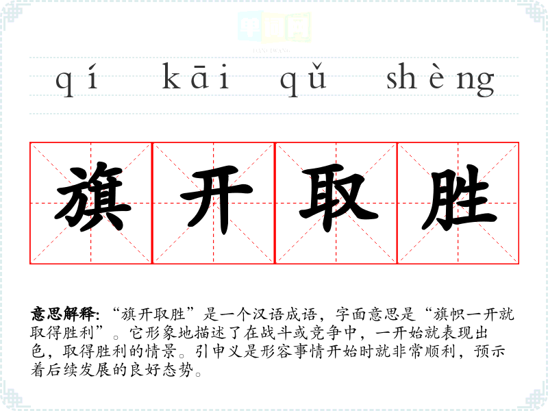 “旗开取胜”是一个汉语成语,字面意思是“旗帜一开就取得胜利”。它形象地描述了在战斗或竞争中,一开始就表现出色,取得胜利的情景。引申义是形容事情开始时就非常顺利,预示着后续发展的良好态势。