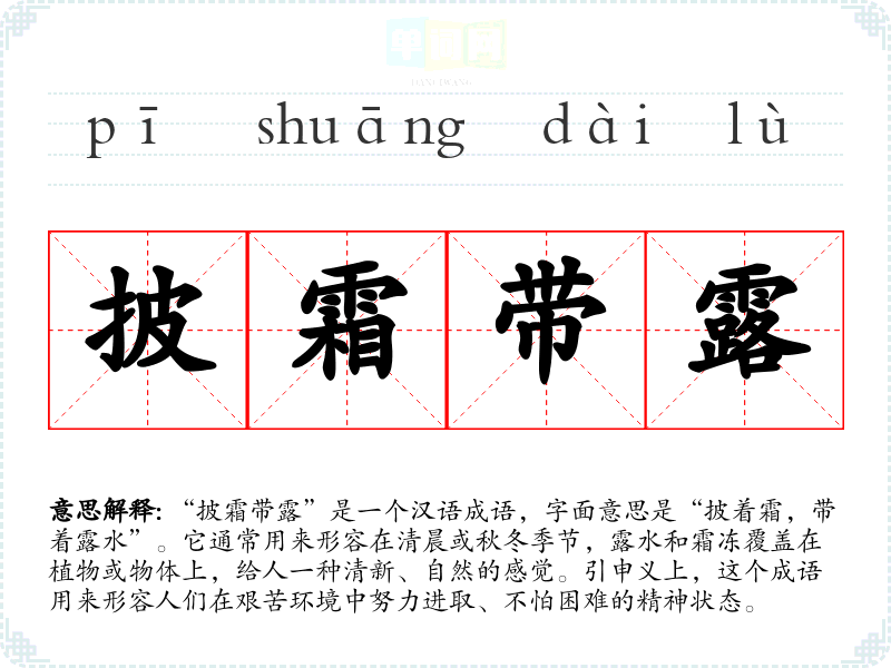 在文学作品中,“披霜带露”常用来描绘清晨的美丽景色,或用作比喻,形容人们在逆境中坚持努力。在日常对话中,它可以用来鼓励他人在面对困难时不放弃。在演讲中,这个成语可能用来强调一种不畏艰难、勇往直前的精神。