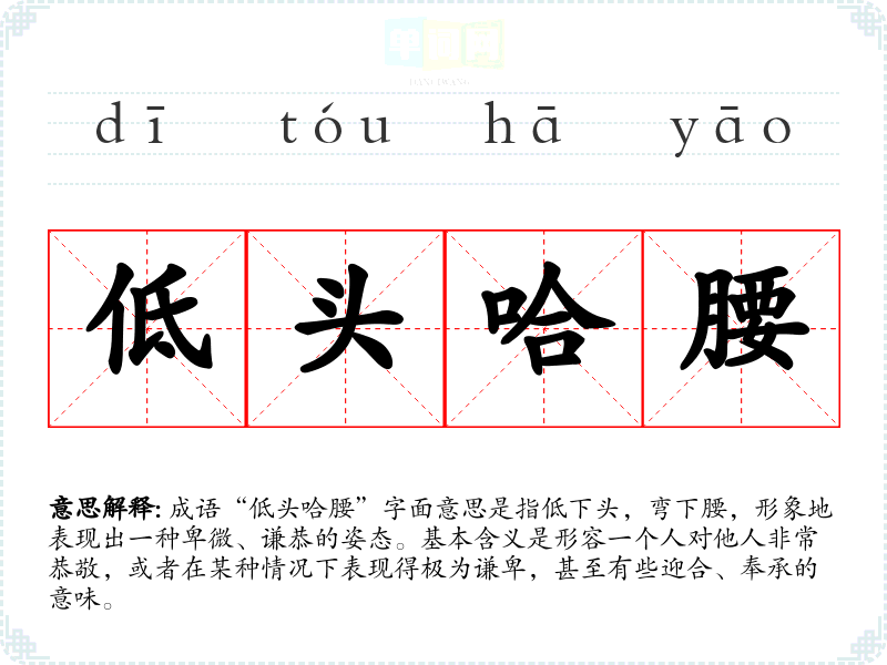 成语“低头哈腰”字面意思是指低下头,弯下腰,形象地表现出一种卑微、谦恭的姿态。基本含义是形容一个人对他人非常恭敬,或者在某种情况下表现得极为谦卑,甚至有些迎合、奉承的意味。