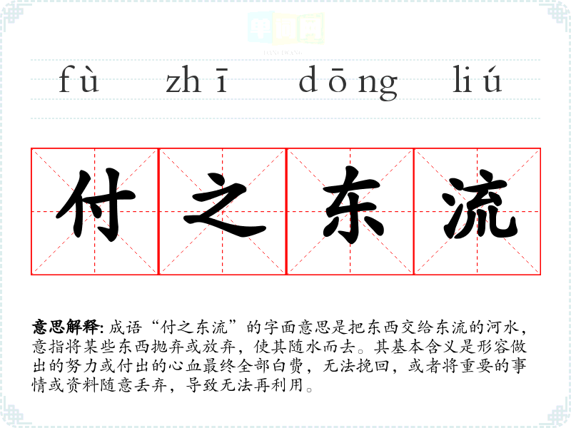成语“付之东流”的字面意思是把东西交给东流的河水,意指将某些东西抛弃或放弃,使其随水而去。其基本含义是形容做出的努力或付出的心血最终全部白费,无法挽回,或者将重要的事情或资料随意丢弃,导致无法再利用。