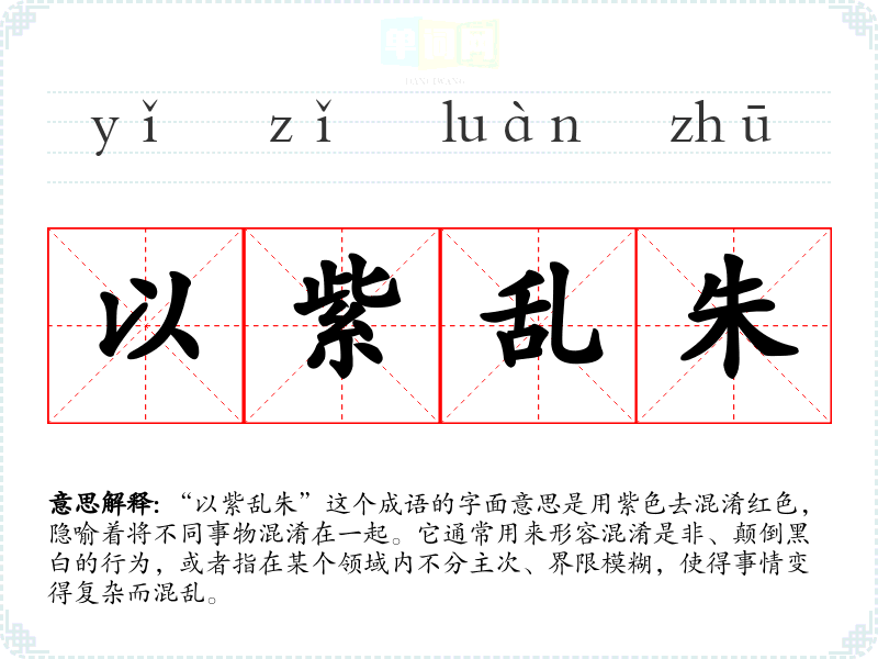 “以紫乱朱”这个成语的字面意思是用紫色去混淆红色,隐喻着将不同事物混淆在一起。它通常用来形容混淆是非、颠倒黑白的行为,或者指在某个领域内不分主次、界限模糊,使得事情变得复杂而混乱。