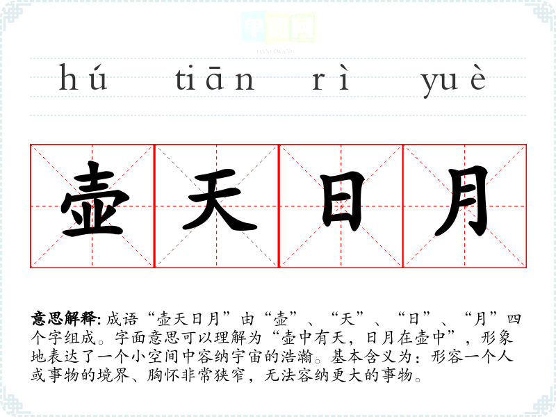 成语“壶天日月”由“壶”、“天”、“日”、“月”四个字组成。字面意思可以理解为“壶中有天,日月在壶中”,形象地表达了一个小空间中容纳宇宙的浩瀚。基本含义为:形容一个人或事物的境界、胸怀非常狭窄,无法容纳更大的事物。