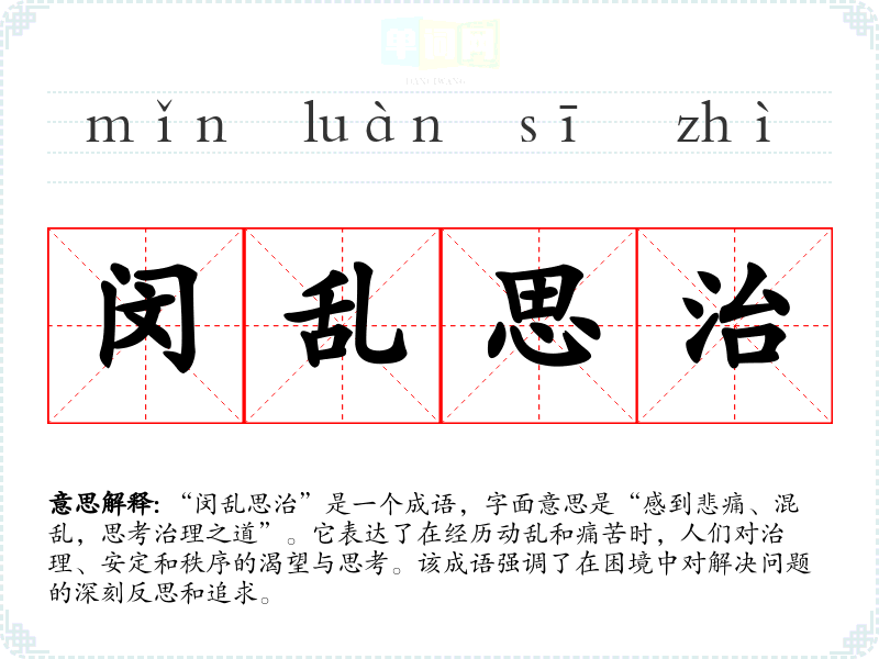 “闵乱思治”是一个成语,字面意思是“感到悲痛、混乱,思考治理之道”。它表达了在经历动乱和痛苦时,人们对治理、安定和秩序的渴望与思考。该成语强调了在困境中对解决问题的深刻反思和追求。