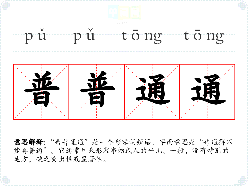 “普普通通”是一个形容词短语,字面意思是“普通得不能再普通”。它通常用来形容事物或人的平凡、一般,没有特别的地方,缺乏突出性或显著性。