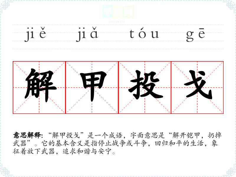 “解甲投戈”是一个成语,字面意思是“解开铠甲,扔掉武器”。它的基本含义是指停止战争或斗争,回归和平的生活,象征着放下武器,追求和谐与安宁。