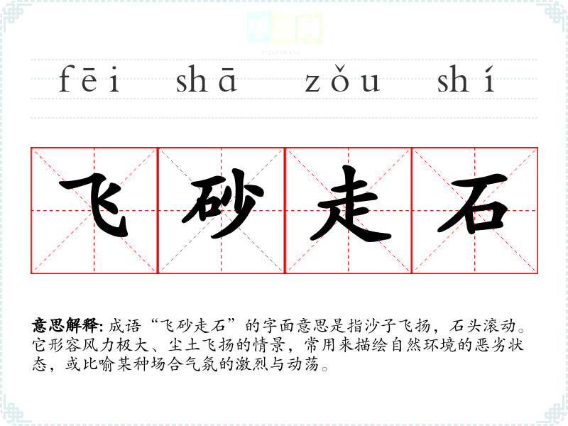成语“飞砂走石”的字面意思是指沙子飞扬,石头滚动。它形容风力极大、尘土飞扬的情景,常用来描绘自然环境的恶劣状态,或比喻某种场合气氛的激烈与动荡。
