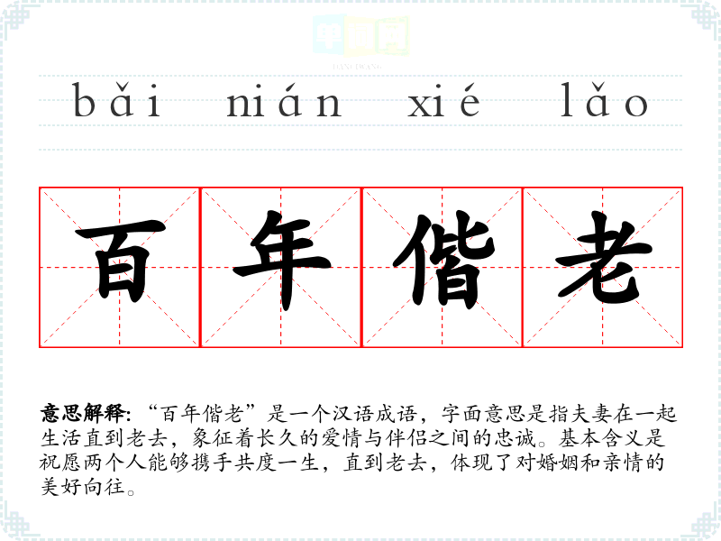 “百年偕老”是一个汉语成语,字面意思是指夫妻在一起生活直到老去,象征着长久的爱情与伴侣之间的忠诚。基本含义是祝愿两个人能够携手共度一生,直到老去,体现了对婚姻和亲情的美好向往。