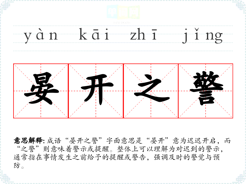 成语“晏开之警”字面意思是“晏开”意为迟迟开启,而“之警”则意味着警示或提醒。整体上可以理解为对迟到的警示,通常指在事情发生之前给予的提醒或警告,强调及时的警觉与预防。