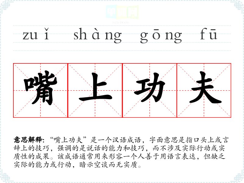 “嘴上功夫”是一个汉语成语,字面意思是指口头上或言辞上的技巧,强调的是说话的能力和技巧,而不涉及实际行动或实质性的成果。该成语通常用来形容一个人善于用语言表达,但缺乏实际的能力或行动,暗示空谈而无实质。