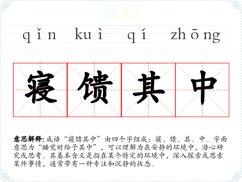 成语“寝馈其中”由四个字组成:寝、馈、其、中。字面意思为“睡觉时给予其中”,可以理解为在安静的环境中,潜心研究或思考。其基本含义是指在某个特定的环境中,深入探索或思索某件事情,通常带有一种专注和沉静的状态。