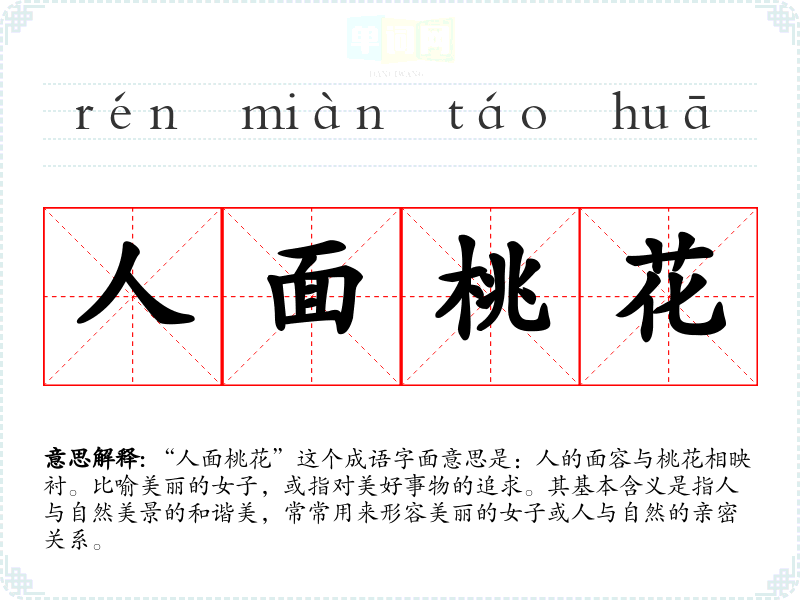 “人面桃花”这个成语字面意思是:人的面容与桃花相映衬。比喻美丽的女子,或指对美好事物的追求。其基本含义是指人与自然美景的和谐美,常常用来形容美丽的女子或人与自然的亲密关系。