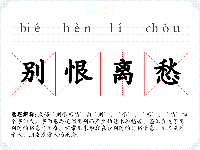 成语“别恨离愁”由“别”、“恨”、“离”、“愁”四个字组成。字面意思是因离别而产生的怨恨和愁苦,整体表达了离别时的伤感与无奈。它常用来形容在分别时的悲伤情感,尤其是对亲人、朋友或爱人的思念。